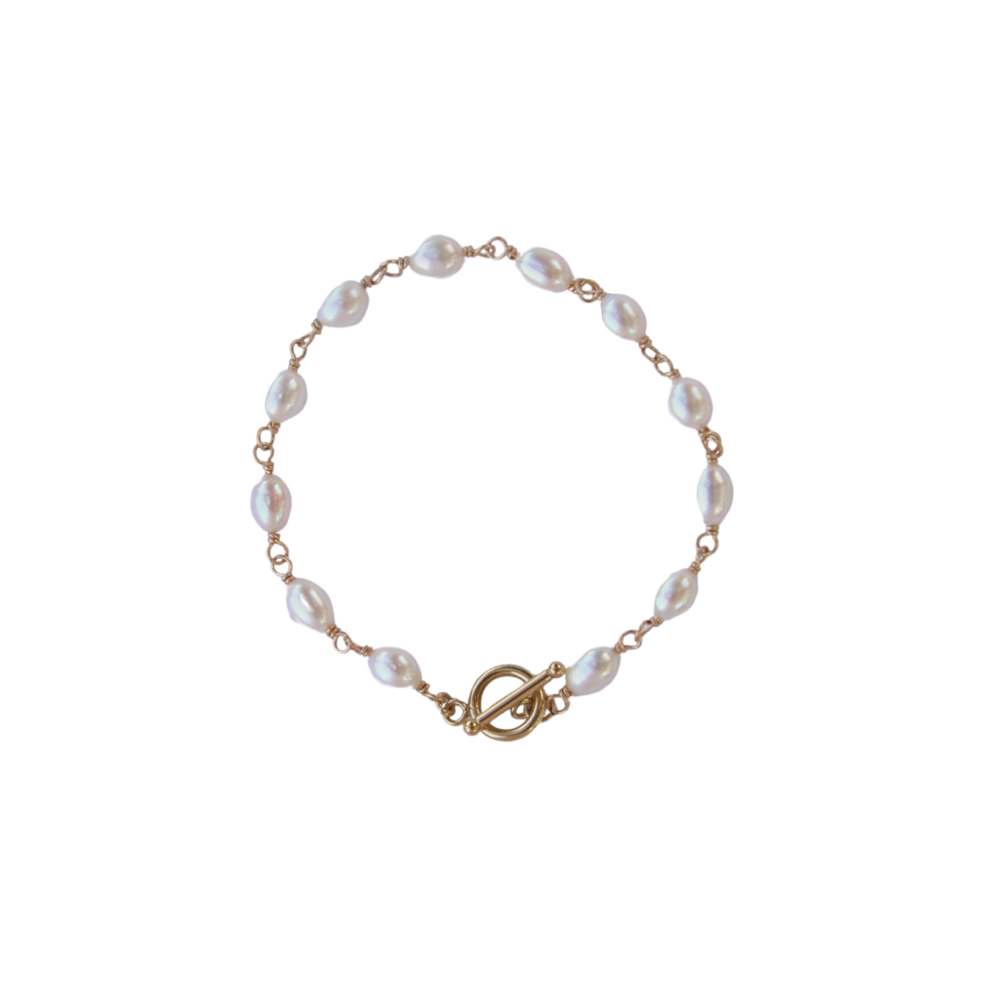 A delicate toggle bracelet made up of 3-4mm rice pearls. Available in sterling silver and gold filled.
