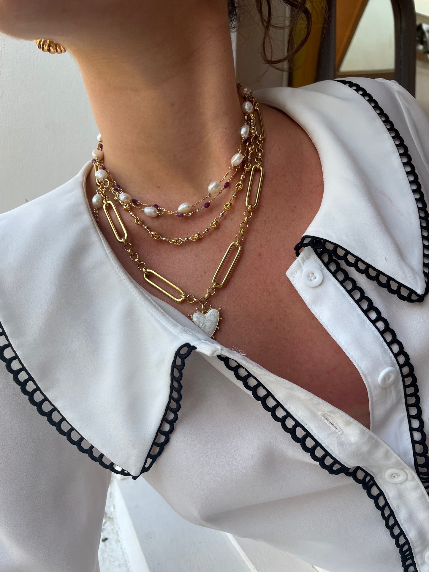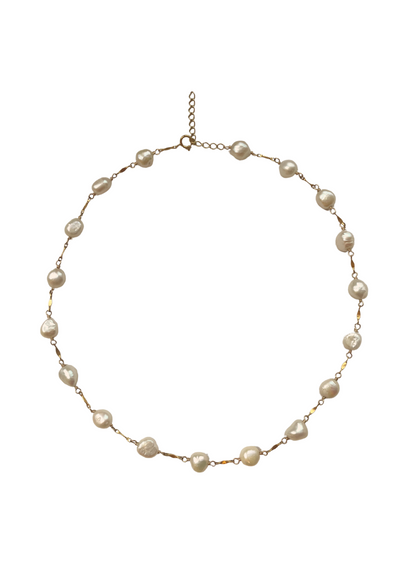Named after the era in which this type of freshwater pearl was first used in jewellery (1600-1750). The Baroque Chain is hand-wrapped with 7-8mm baroque pearls and gold-filled bars.