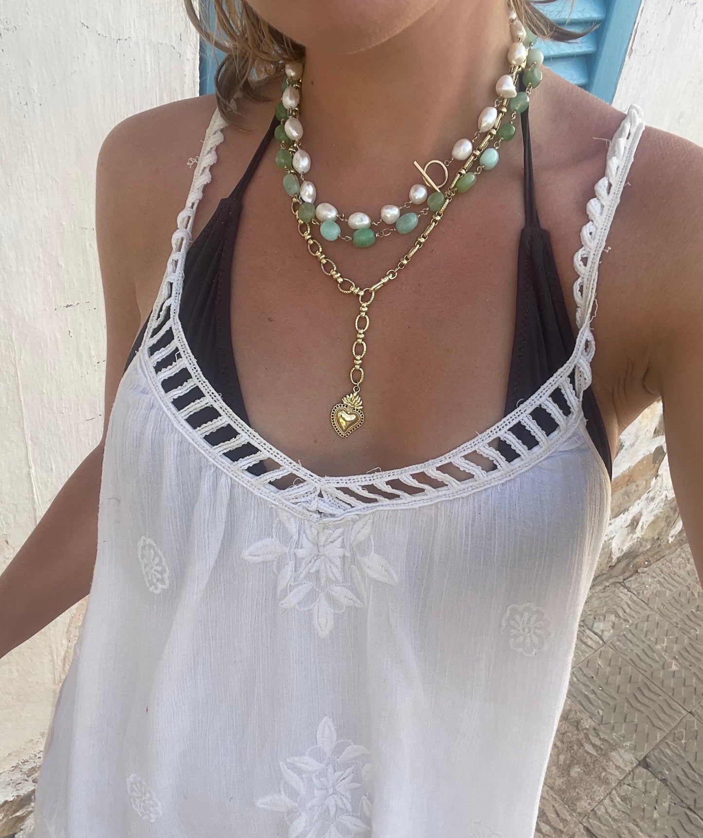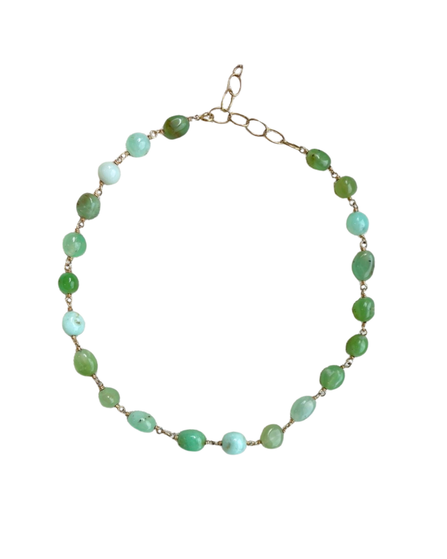 Made with beautiful chyrsoprase gemstone, this hand-wrapped rosary chain will add a hint of summer to any outfit.